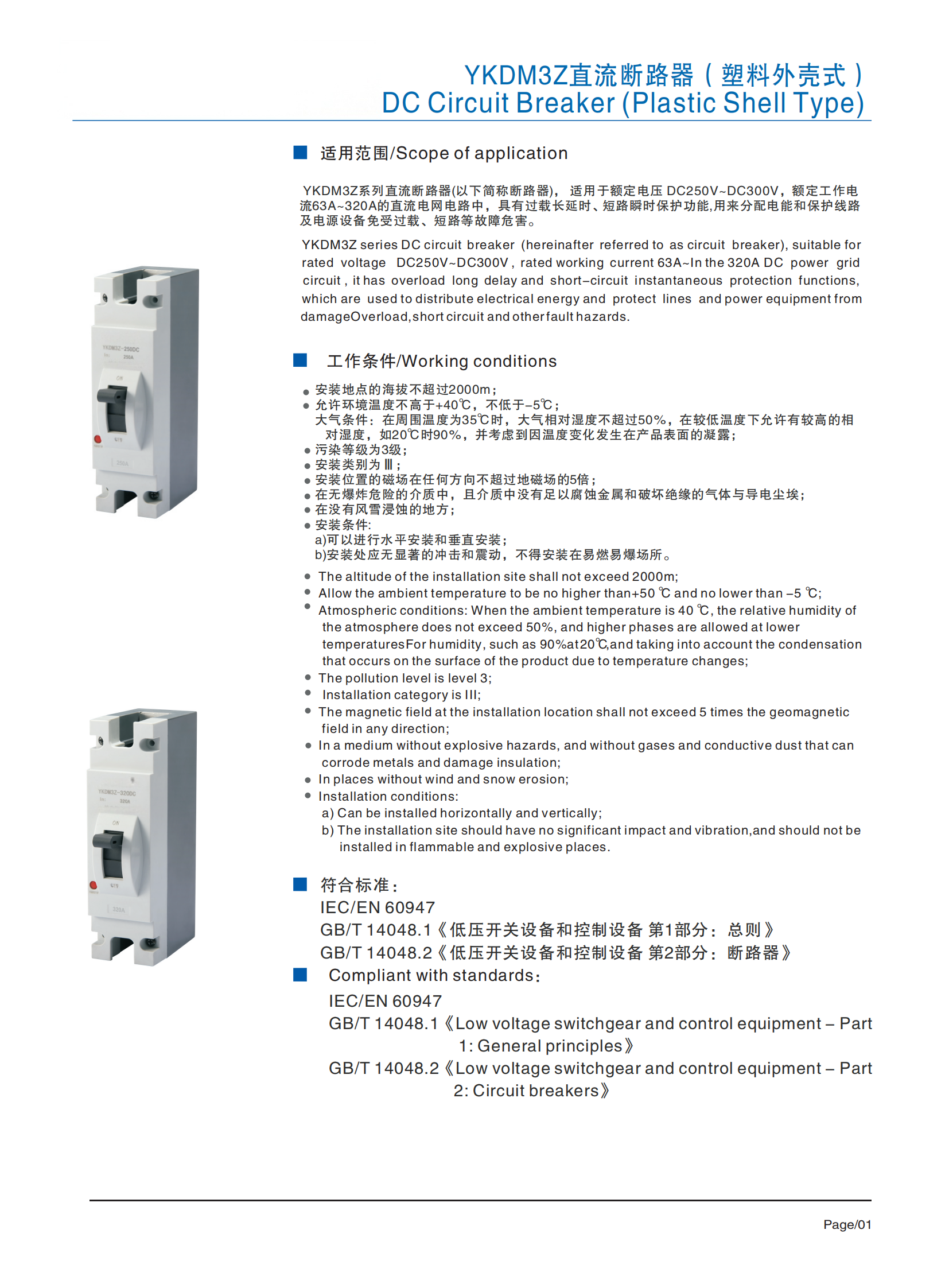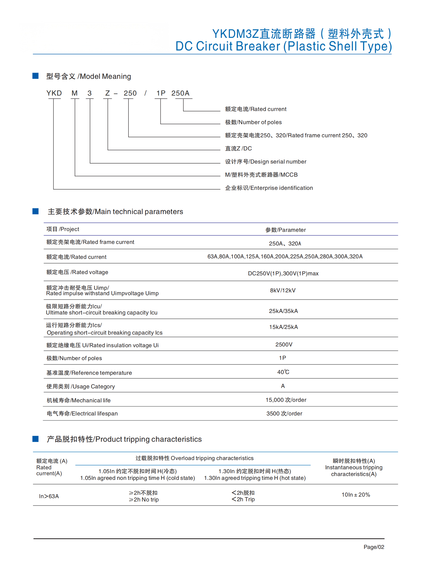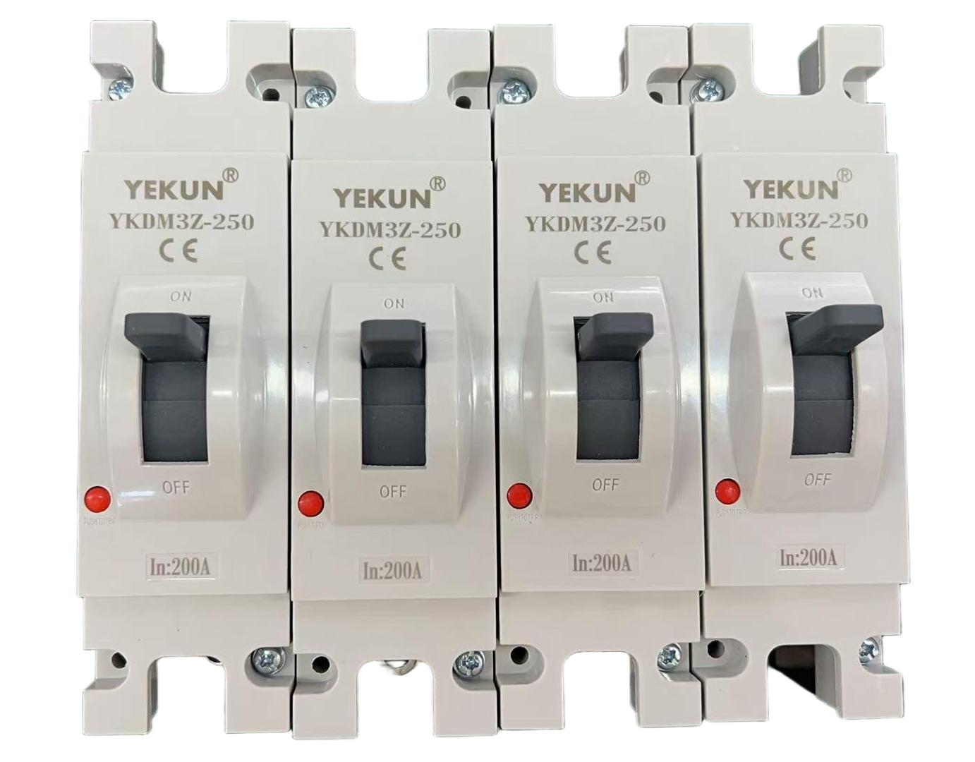 YKDM3Z series DC circuit breaker (hereinafter referred to as circuit breaker), suitable forrated voltage DC250V~DC300V, rated working current 63A-In the 320A DC power gridcircuit , it has overload long delay and short-circuit instantaneous protection functions.which are used to distribute electrical energy and protect lines and power equipment fromdamageOverload,short circuit and otherfaulthazards.