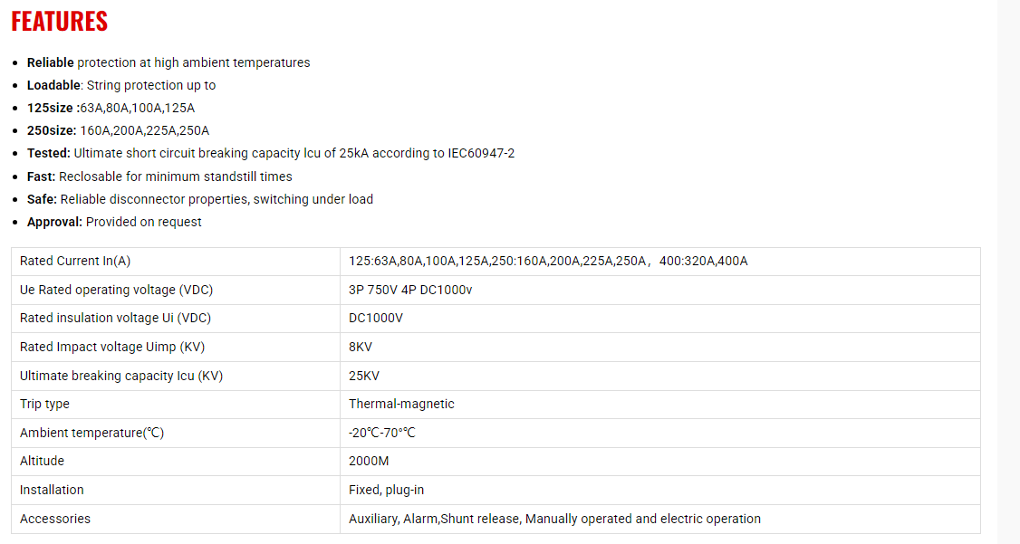 | Accessories | Auxiliary, Alarm,Shunt release, Manually operated and electric operation | Rated insulation voltage Ui | DC1000V |